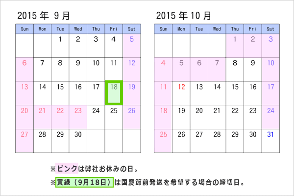 ですので、シルバーウィーク前の発送をご希望される方は、今週中にご注文(初めての方は今週中の入金確認完了)を、また中秋節・国慶節前のご注文であれば、来週中にご注文(初めての方は来週中の入金確認完了)されることをおすすめします。